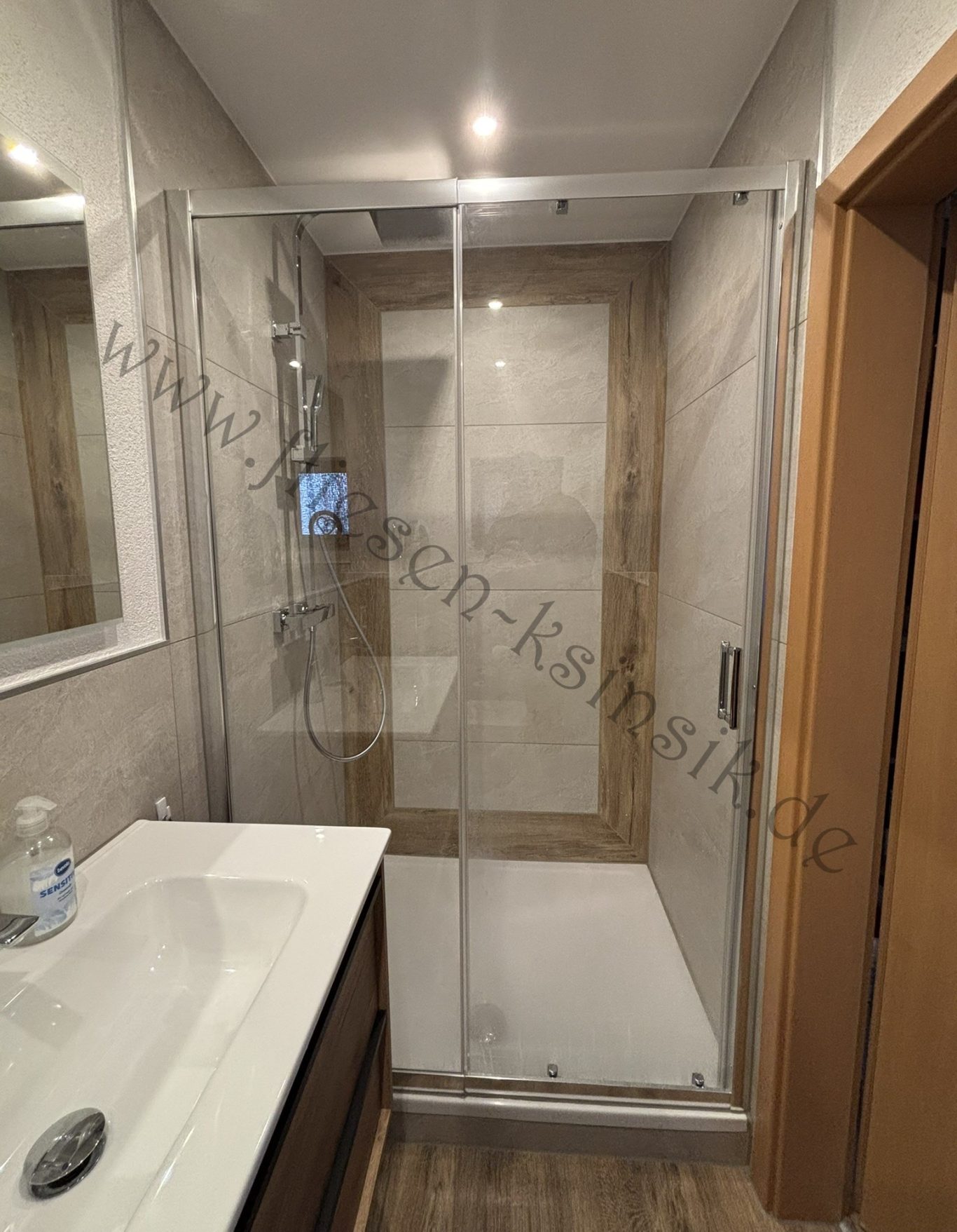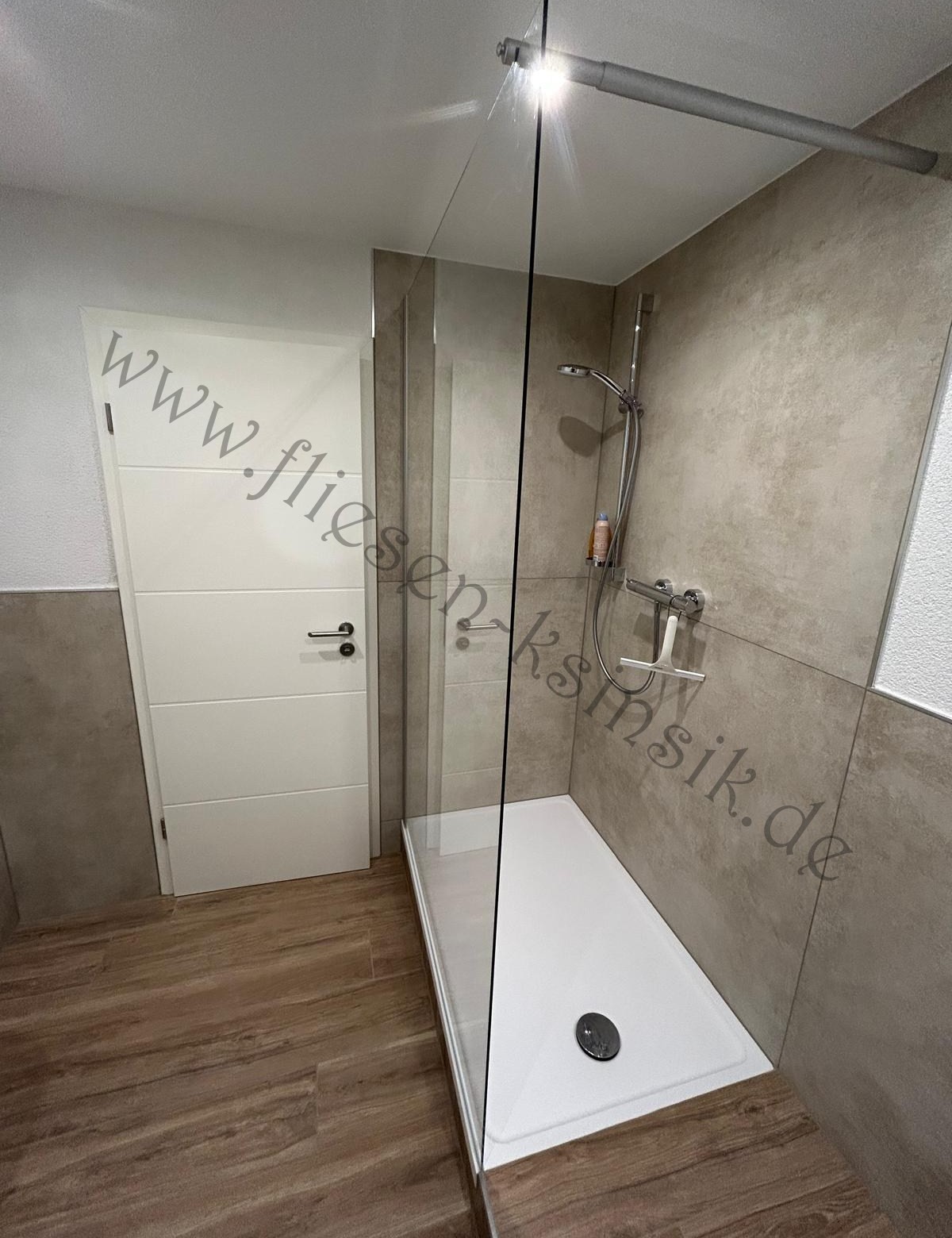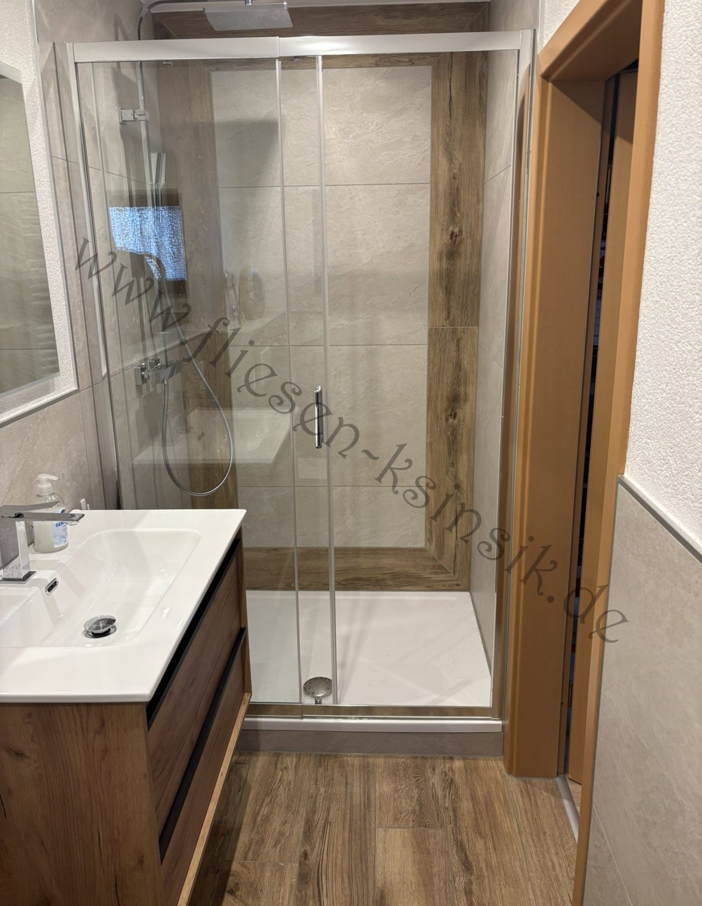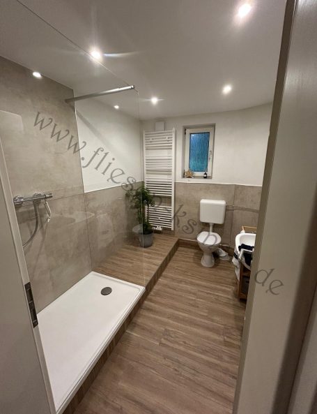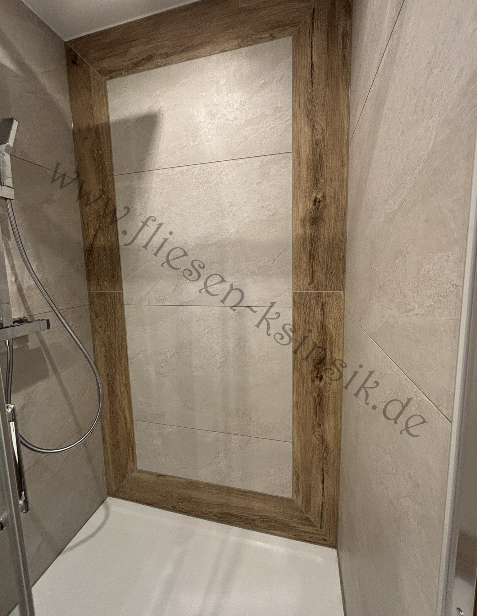 Badsanierung mit Großformat, 120x60cm Wandfliesen und 120x20 cm Holzoptikfliesen. Besonderheit hier: die Duschrückwand!
