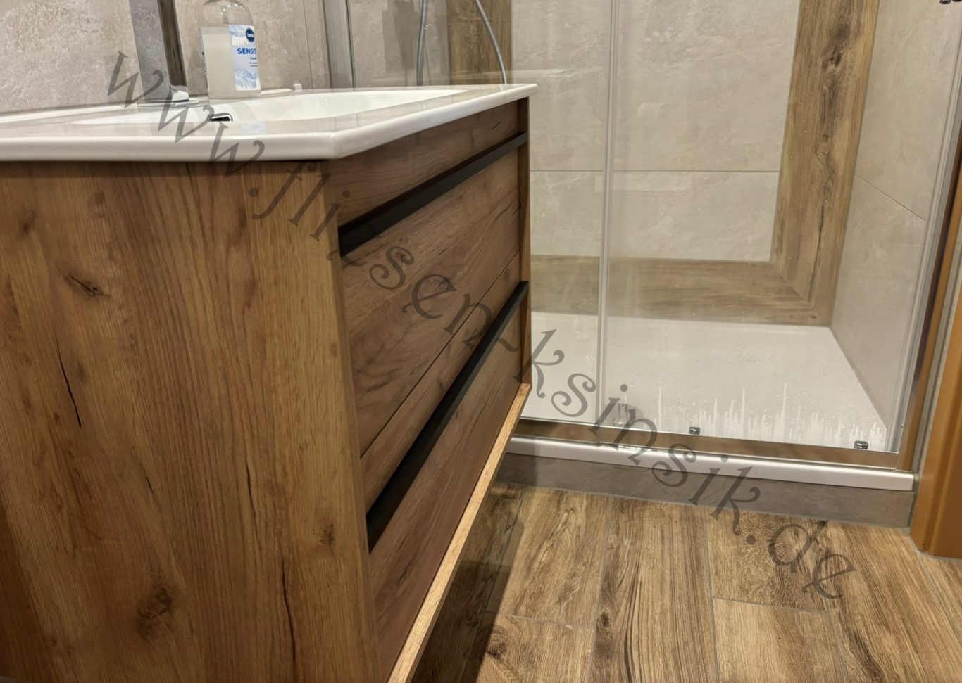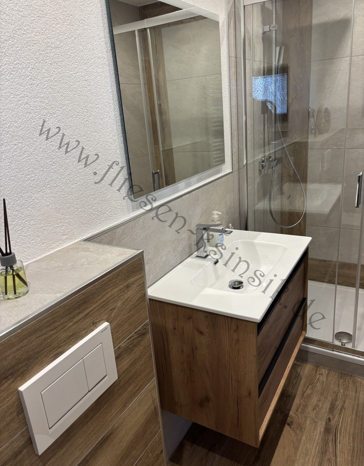 Badsanierung mit Großformatfliesen 120x120cm kombiniert mit einer Holzoptikfliese im Format 30x120cm